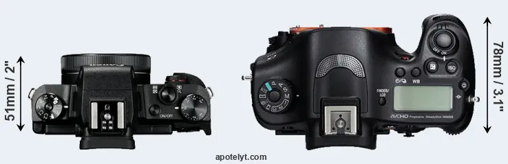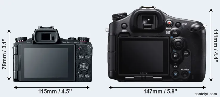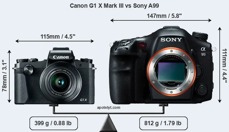 The side-by-side display below illustrates the physical size and weight of the Canon G1 X Mark III and the Sony A99. The two cameras are presented according to their relative size. Three consecutive perspectives from the front, the top, and the back are available. All width, height and depth dimensions are rounded to the nearest millimeter.