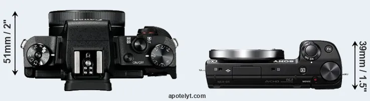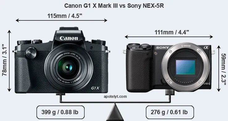 An illustration of the physical size and weight of the Canon G1 X Mark III and the Sony NEX-5R is provided in the side-by-side display below. The two cameras are presented according to their relative size. Three successive views from the front, the top, and the rear are shown. All width, height and depth dimensions are rounded to the nearest millimeter.