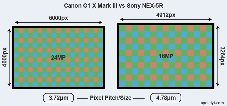 Despite having a smaller sensor, the Canon G1 X Mark III offers a higher resolution of 24 megapixels, compared with 16 MP of the Sony NEX-5R. This megapixels advantage comes at the cost of a higher pixel density and a smaller size of the individual pixel (with a pixel pitch of 3.72μm versus 4.78μm for the NEX-5R). However, it should be noted that the G1X Mark III is much more recent (by 5 years and 1 month) than the NEX-5R, and its sensor will have benefitted from technological advances during this time that make it possible to gather light more efficiently.