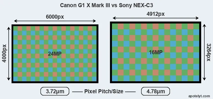 Despite having a smaller sensor, the Canon G1 X Mark III offers a higher resolution of 24 megapixels, compared with 16 MP of the Sony NEX-C3. This megapixels advantage comes at the cost of a higher pixel density and a smaller size of the individual pixel (with a pixel pitch of 3.72μm versus 4.78μm for the NEX-C3). However, it should be noted that the G1X Mark III is much more recent (by 6 years and 4 months) than the NEX-C3, and its sensor will have benefitted from technological advances during this time that make it possible to gather light more efficiently.