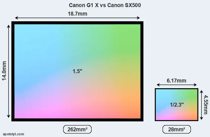 Of the two cameras under consideration, the Canon G1 X features an 1.5-inch sensor and the Canon SX500 a 1/2.3-inch sensor. The sensor area in the SX500 is 89 percent smaller. As a result of these sensor size differences, the cameras have a format factor of, respectively, 1.85 and 5.6. Both cameras feature a native aspect ratio (sensor width to sensor height) of 4:3.