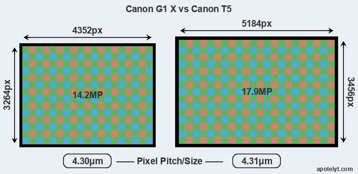 With 17.9MP, the T5 offers a higher resolution than the G1X (14.2MP), but the T5 nevertheless has marginally larger individual pixels (pixel pitch of 4.31μm versus 4.30μm for the G1X) due to its larger sensor. Moreover, the T5 is a much more recent model (by 2 years and 1 month) than the G1X, and its sensor will have benefitted from technological advances during this time that further enhance the light gathering capacity of its pixel-units.