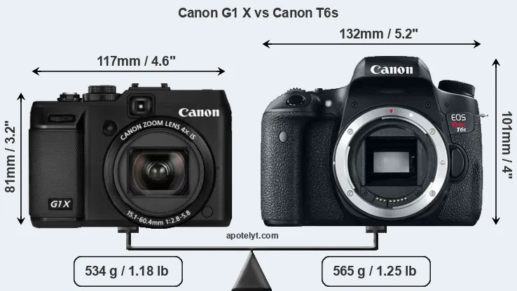 An illustration of the physical size and weight of the Canon G1 X and the Canon T6s is provided in the side-by-side display below. The two cameras are presented according to their relative size. Three consecutive perspectives from the front, the top, and the back are available. All width, height and depth dimensions are rounded to the nearest millimeter.