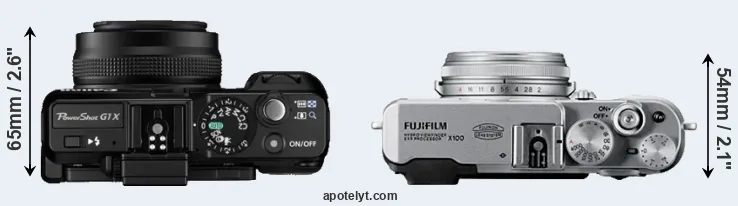 The side-by-side display below illustrates the physical size and weight of the Canon G1 X and the Fujifilm X100. The two cameras are presented according to their relative size. Three consecutive perspectives from the front, the top, and the back are available. All width, height and depth dimensions are rounded to the nearest millimeter.