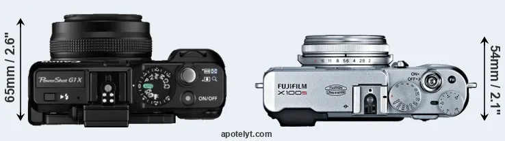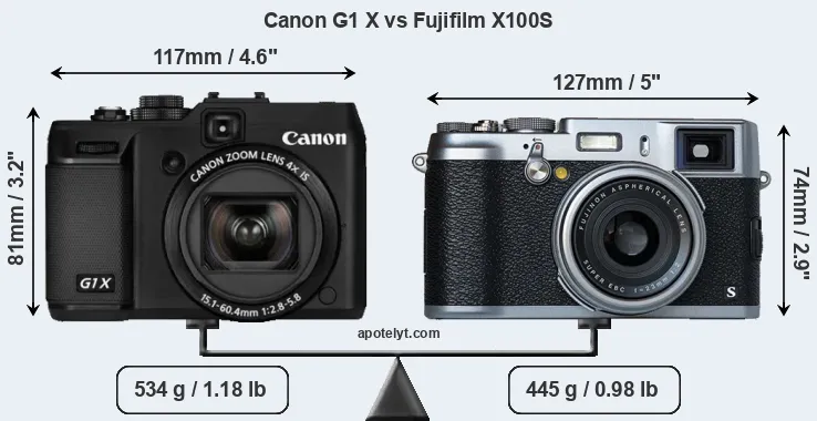 The physical size and weight of the Canon G1 X and the Fujifilm X100S are illustrated in the side-by-side display below. The two cameras are presented according to their relative size. Three consecutive perspectives from the front, the top, and the back are available. All width, height and depth dimensions are rounded to the nearest millimeter.