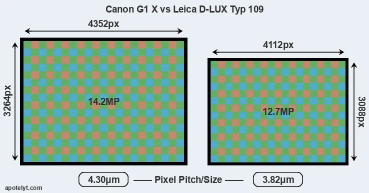 With 14.2MP, the G1X offers a higher resolution than the D-LUX Typ 109 (12.7MP), but the G1X nevertheless has larger individual pixels (pixel pitch of 4.30μm versus 3.82μm for the D-LUX Typ 109) due to its larger sensor. However, the D-LUX Typ 109 is a much more recent model (by 2 years and 8 months) than the G1X, and its sensor will have benefitted from technological advances during this time that further enhance the light gathering capacity of its pixels.