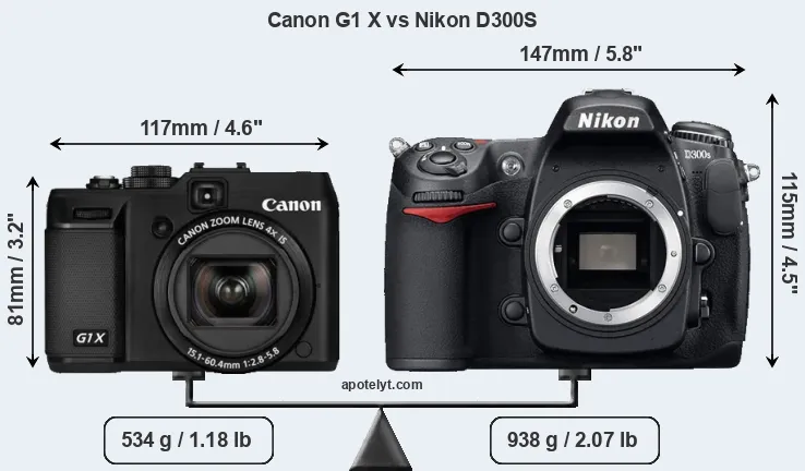 An illustration of the physical size and weight of the Canon G1 X and the Nikon D300S is provided in the side-by-side display below. The two cameras are presented according to their relative size. Three successive views from the front, the top, and the rear are shown. All width, height and depth dimensions are rounded to the nearest millimeter.