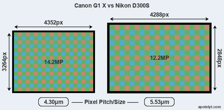 Despite having a smaller sensor, the Canon G1 X offers a higher resolution of 14.2 megapixels, compared with 12.2 MP of the Nikon D300S. This megapixels advantage comes at the cost of a higher pixel density and a smaller size of the individual pixel (with a pixel pitch of 4.30μm versus 5.53μm for the D300S). However, it should be noted that the G1X is much more recent (by 2 years and 5 months) than the D300S, and its sensor will have benefitted from technological advances during this time that make it possible to gather light more efficiently.