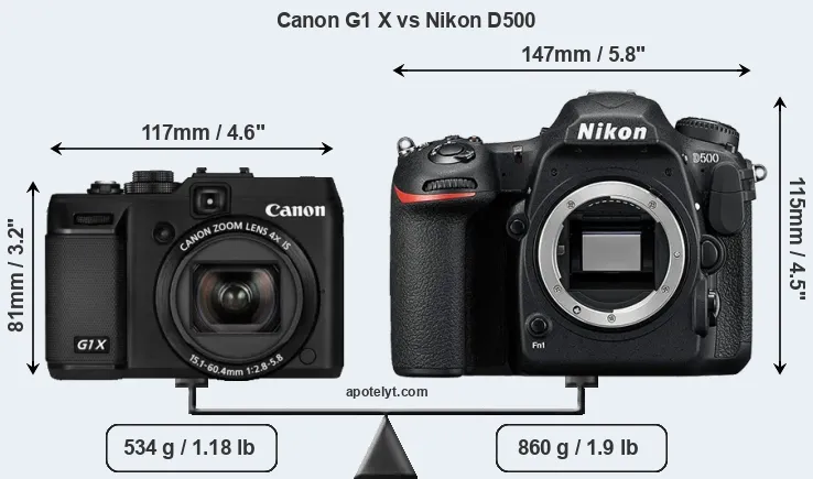 The side-by-side display below illustrates the physical size and weight of the Canon G1 X and the Nikon D500. The two cameras are presented according to their relative size. Three successive views from the front, the top, and the rear are shown. All width, height and depth measures are rounded to the nearest millimeter.