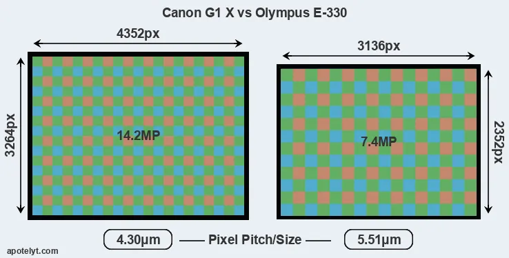With 14.2MP, the G1X offers a higher resolution than the E-330 (7.4MP), but the G1X has smaller individual pixels (pixel pitch of 4.30μm versus 5.51μm for the E-330). However, the G1X is a much more recent model (by 5 years and 11 months) than the E-330, and its sensor will have benefitted from technological advances during this time that enhance the light gathering capacity of its pixels.
