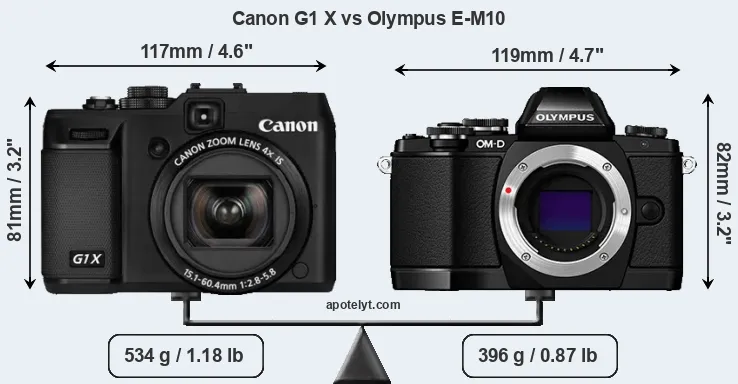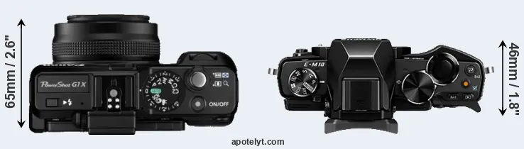 The physical size and weight of the Canon G1 X and the Olympus E-M10 are illustrated in the side-by-side display below. The two cameras are presented according to their relative size. Three consecutive perspectives from the front, the top, and the back are available. All width, height and depth measures are rounded to the nearest millimeter.