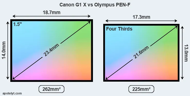 Of the two cameras under consideration, the Canon G1 X features an 1.5-inch sensor and the Olympus PEN-F a Four Thirds sensor. The sensor area in the PEN-F is 14 percent smaller. As a result of these sensor size differences, the cameras have a format factor of, respectively, 1.85 and 2.0. Both cameras feature a native aspect ratio (sensor width to sensor height) of 4:3.