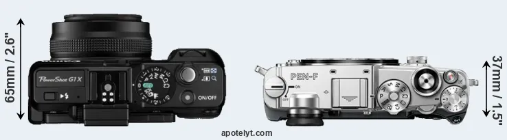 The above size and weight comparisons are to some extent incomplete and possibly misleading, as the G1X has a lens built in, whereas the PEN-F is an interchangeable lens camera that requires a separate lens. Attaching the latter will add extra weight and bulk to the setup. You can compare the optics available for the PEN-F and their specifications in the Micro Four Thirds Lens Catalog.