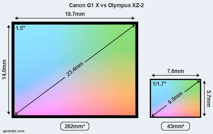 Of the two cameras under consideration, the Canon G1 X features an 1.5-inch sensor and the Olympus XZ-2 a 1/1.7-inch sensor. The sensor area in the XZ-2 is 84 percent smaller. As a result of these sensor size differences, the cameras have a format factor of, respectively, 1.85 and 4.4. Both cameras feature a native aspect ratio (sensor width to sensor height) of 4:3.