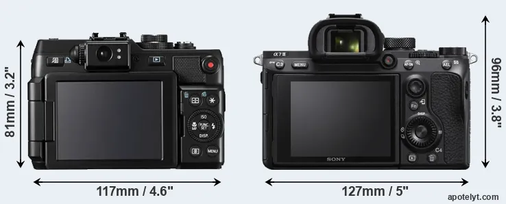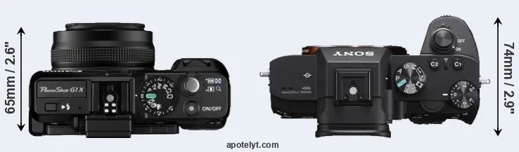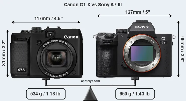 The above size and weight comparisons are to some extent incomplete and possibly misleading, as the G1X has a lens built in, whereas the A7 III is an interchangeable lens camera that requires a separate lens. Attaching the latter will add extra weight and bulk to the setup. You can compare the optics available for the A7 III and their specifications in the Sony FE Lens Catalog.