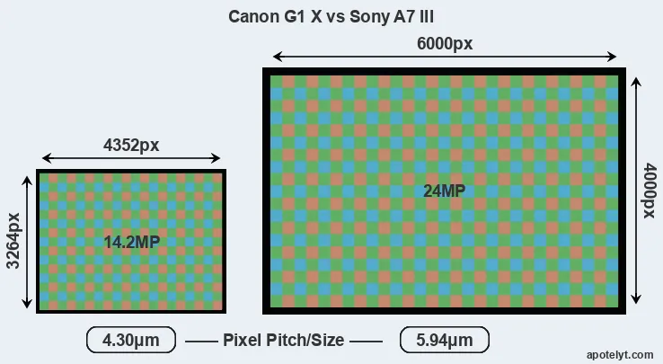 With 24MP, the A7 III offers a higher resolution than the G1X (14.2MP), but the A7 III nevertheless has larger individual pixels (pixel pitch of 5.94μm versus 4.30μm for the G1X) due to its larger sensor. Moreover, the A7 III is a much more recent model (by 6 years and 1 month) than the G1X, and its sensor will have benefitted from technological advances during this time that further enhance the light gathering capacity of its pixel-units.