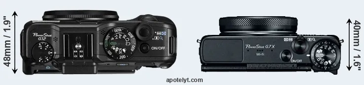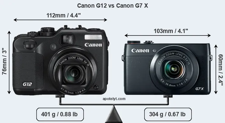 An illustration of the physical size and weight of the Canon G12 and the Canon G7 X is provided in the side-by-side display below. The two cameras are presented according to their relative size. Three successive views from the front, the top, and the rear are shown. All width, height and depth measures are rounded to the nearest millimeter.