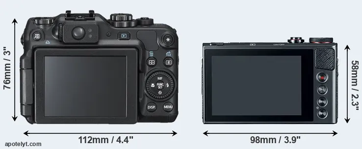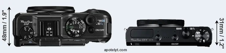 An illustration of the physical size and weight of the Canon G12 and the Canon G9 X is provided in the side-by-side display below. The two cameras are presented according to their relative size. Three consecutive views from the front, the top, and the rear side are shown. All width, height and depth measures are rounded to the nearest millimeter.