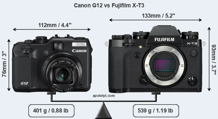 An illustration of the physical size and weight of the Canon G12 and the Fujifilm X-T3 is provided in the side-by-side display below. The two cameras are presented according to their relative size. Three consecutive perspectives from the front, the top, and the back are available. All width, height and depth measures are rounded to the nearest millimeter.