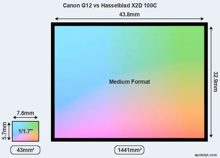 Of the two cameras under consideration, the Canon G12 features a 1/1.7-inch sensor and the Hasselblad X2D 100C a medium format sensor. The sensor area in the X2D 100C is 3251 percent bigger. As a result of these sensor size differences, the cameras have a format factor of, respectively, 4.6 and 0.79. Both cameras feature a native aspect ratio (sensor width to sensor height) of 4:3.