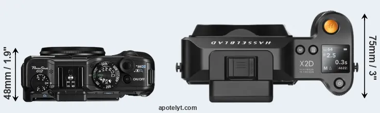 The physical size and weight of the Canon G12 and the Hasselblad X2D 100C are illustrated in the side-by-side display below. The two cameras are presented according to their relative size. Three consecutive views from the front, the top, and the rear side are shown. All width, height and depth dimensions are rounded to the nearest millimeter.