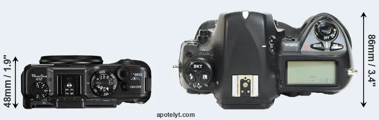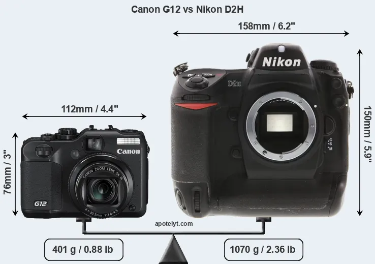 The physical size and weight of the Canon G12 and the Nikon D2H are illustrated in the side-by-side display below. The two cameras are presented according to their relative size. Three consecutive perspectives from the front, the top, and the back are available. All width, height and depth measures are rounded to the nearest millimeter.