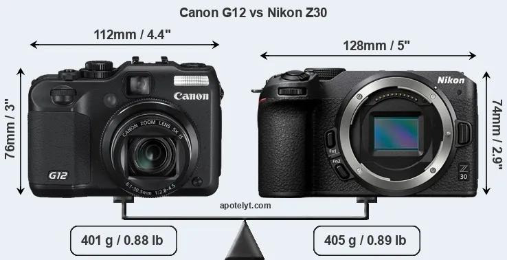 The side-by-side display below illustrates the physical size and weight of the Canon G12 and the Nikon Z30. The two cameras are presented according to their relative size. Three consecutive views from the front, the top, and the rear side are shown. All width, height and depth dimensions are rounded to the nearest millimeter.