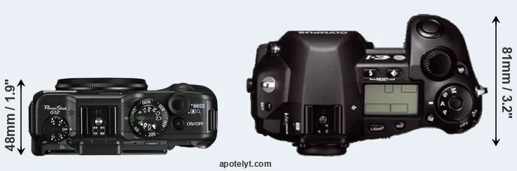If the front view area (width x height) of the cameras is taken as an aggregate measure of their size, the Olympus E-1 is considerably larger (72 percent) than the Canon G12. It is noteworthy in this context that the E-1 is splash and dust-proof, while the G12 does not feature any corresponding weather-sealing.