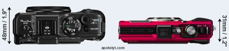 The side-by-side display below illustrates the physical size and weight of the Canon G12 and the Olympus TG-4. The two cameras are presented according to their relative size. Three consecutive perspectives from the front, the top, and the back are available. All width, height and depth dimensions are rounded to the nearest millimeter.