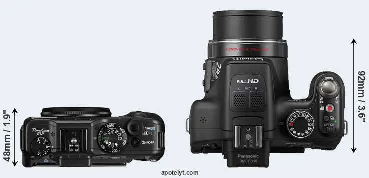 The side-by-side display below illustrates the physical size and weight of the Canon G12 and the Panasonic FZ150. The two cameras are presented according to their relative size. Three consecutive views from the front, the top, and the rear side are shown. All size dimensions are rounded to the nearest millimeter.