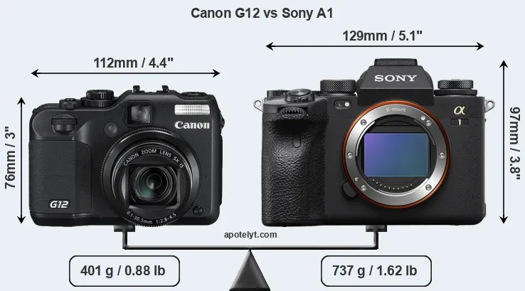 If the front view area (width x height) of the cameras is taken as an aggregate measure of their size, the Sony A1 is considerably larger (47 percent) than the Canon G12. It is noteworthy in this context that the A1 is splash and dust-proof, while the G12 does not feature any corresponding weather-sealing.