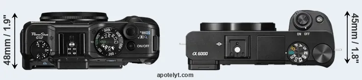 The physical size and weight of the Canon G12 and the Sony A6000 are illustrated in the side-by-side display below. The two cameras are presented according to their relative size. Three consecutive views from the front, the top, and the rear side are shown. All width, height and depth measures are rounded to the nearest millimeter.