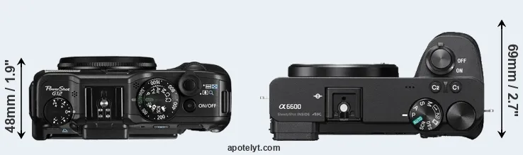The physical size and weight of the Canon G12 and the Sony A6600 are illustrated in the side-by-side display below. The two cameras are presented according to their relative size. Three consecutive views from the front, the top, and the rear side are shown. All width, height and depth measures are rounded to the nearest millimeter.