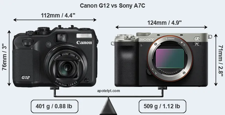 The side-by-side display below illustrates the physical size and weight of the Canon G12 and the Sony A7C. The two cameras are presented according to their relative size. Three successive views from the front, the top, and the rear are shown. All width, height and depth measures are rounded to the nearest millimeter.