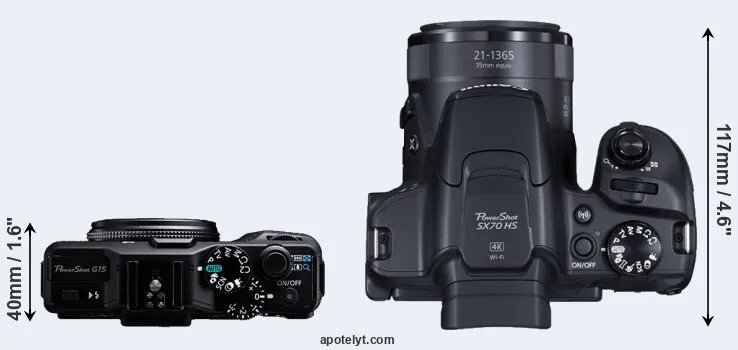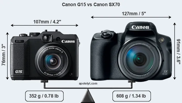 The side-by-side display below illustrates the physical size and weight of the Canon G15 and the Canon SX70. The two cameras are presented according to their relative size. Three consecutive perspectives from the front, the top, and the back are available. All width, height and depth dimensions are rounded to the nearest millimeter.