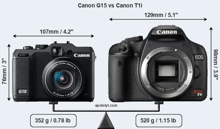 An illustration of the physical size and weight of the Canon G15 and the Canon T1i is provided in the side-by-side display below. The two cameras are presented according to their relative size. Three consecutive views from the front, the top, and the rear side are shown. All width, height and depth measures are rounded to the nearest millimeter.