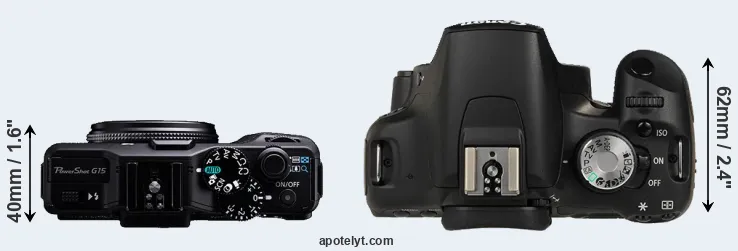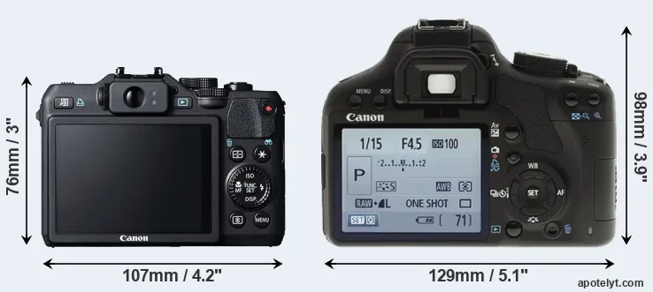 The above size and weight comparisons are to some extent incomplete and possibly misleading, as the G15 has a lens built in, whereas the T1i is an interchangeable lens camera that requires a separate lens. Attaching the latter will add extra weight and bulk to the setup. You can compare the optics available for the T1i and their specifications in the Canon EF Lens Catalog.