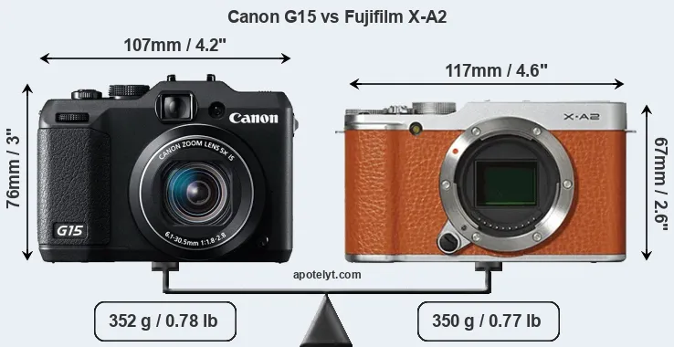 The physical size and weight of the Canon G15 and the Fujifilm X-A2 are illustrated in the side-by-side display below. The two cameras are presented according to their relative size. Three successive views from the front, the top, and the rear are shown. All width, height and depth dimensions are rounded to the nearest millimeter.