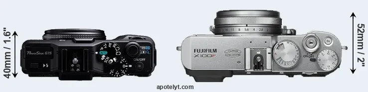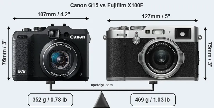 An illustration of the physical size and weight of the Canon G15 and the Fujifilm X100F is provided in the side-by-side display below. The two cameras are presented according to their relative size. Three consecutive perspectives from the front, the top, and the back are available. All width, height and depth dimensions are rounded to the nearest millimeter.