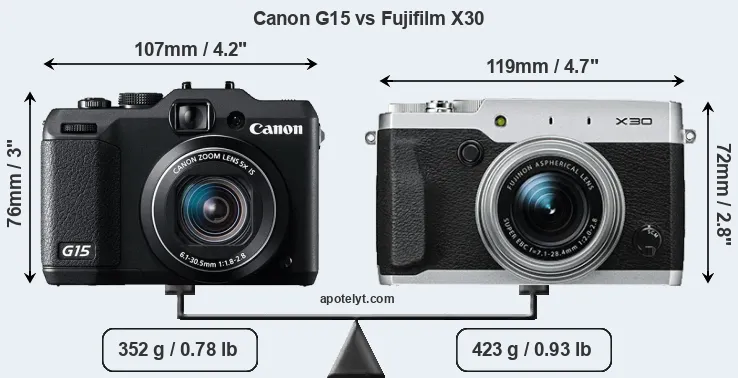An illustration of the physical size and weight of the Canon G15 and the Fujifilm X30 is provided in the side-by-side display below. The two cameras are presented according to their relative size. Three consecutive views from the front, the top, and the rear side are shown. All width, height and depth measures are rounded to the nearest millimeter.
