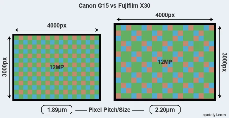 Even though the X30 has a larger sensor, both cameras offer the same resolution of 12 megapixels. This implies that the X30 has a lower pixel density and larger individual pixels (with a pixel pitch of 2.20μm versus 1.89μm for the G15), which gives it a potential advantage in terms of light gathering capacity. In addition, the X30 is a somewhat more recent model (by 1 year and 11 months) than the G15, and its sensor might have benefitted from technological advances during this time. Coming back to sensor resolution, it should be mentioned that the X30 has no anti-alias filter installed, so that it can capture all the detail its sensor resolves.
