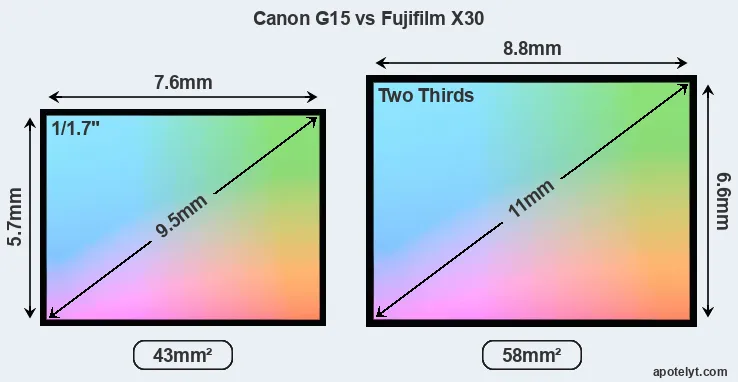 Of the two cameras under consideration, the Canon G15 features a 1/1.7-inch sensor and the Fujifilm X30 a 2/3 sensor. The sensor area in the X30 is 35 percent bigger. As a result of these sensor size differences, the cameras have a format factor of, respectively, 4.6 and 3.9. Both cameras feature a native aspect ratio (sensor width to sensor height) of 4:3.