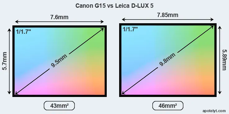 Both cameras under consideration feature a 1/1.7-inch sensor, but their sensors differ slightly in size. The sensor area in the D-LUX 5 is 7 percent bigger. As a result of these sensor size differences, the cameras have format factors, respectively, of 4.6 (G15) and 4.4. Both cameras feature a native aspect ratio (sensor width to sensor height) of 4:3. The D-LUX 5 has the particularity of featuring a switch that allows to toggle between multiple aspect ratios, while maintaining the same field of view and full image resolution.