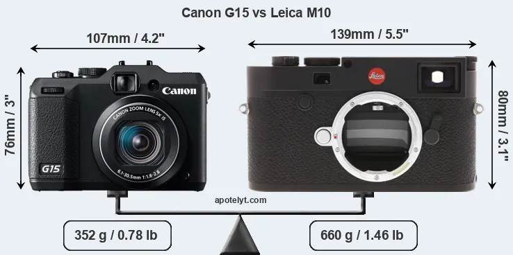 If the front view area (width x height) of the cameras is taken as an aggregate measure of their size, the Leica M10 is notably larger (37 percent) than the Canon G15. It is noteworthy in this context that the M10 is splash and dust-proof, while the G15 does not feature any corresponding weather-sealing.