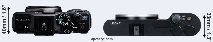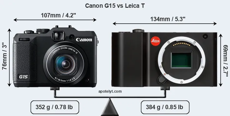 An illustration of the physical size and weight of the Canon G15 and the Leica T is provided in the side-by-side display below. The two cameras are presented according to their relative size. Three successive views from the front, the top, and the rear are shown. All width, height and depth measures are rounded to the nearest millimeter.