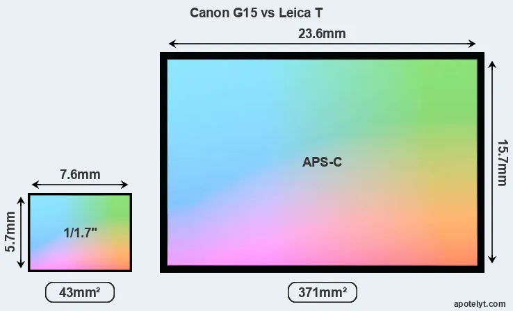 Of the two cameras under consideration, the Canon G15 features a 1/1.7-inch sensor and the Leica T an APS-C sensor. The sensor area in the T Typ 701 is 763 percent bigger. As a result of these sensor size differences, the cameras have a format factor of, respectively, 4.6 and 1.5. The sensor in the G15 has a native 4:3 aspect ratio, while the one in the T Typ 701 offers a 3:2 aspect.