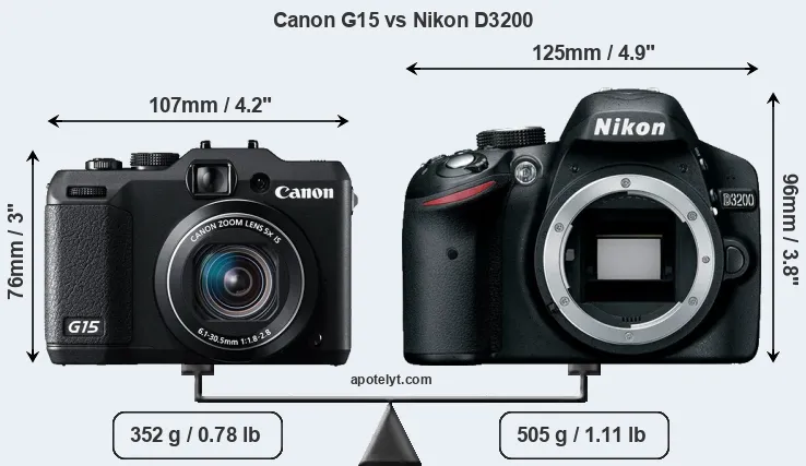 The side-by-side display below illustrates the physical size and weight of the Canon G15 and the Nikon D3200. The two cameras are presented according to their relative size. Three consecutive views from the front, the top, and the rear side are shown. All width, height and depth dimensions are rounded to the nearest millimeter.