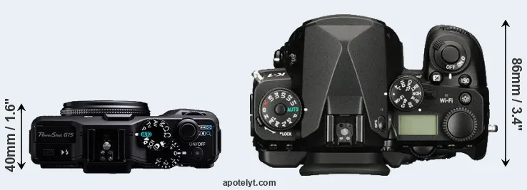 If the front view area (width x height) of the cameras is taken as an aggregate measure of their size, the Pentax K-1 is considerably larger (85 percent) than the Canon G15. It is noteworthy in this context that the K-1 is splash and dust-proof, while the G15 does not feature any corresponding weather-sealing.
