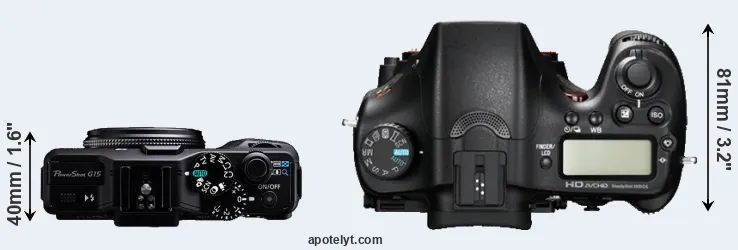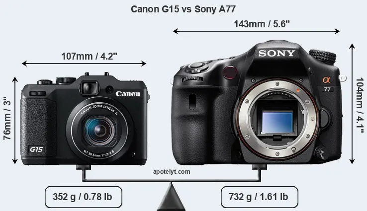 The side-by-side display below illustrates the physical size and weight of the Canon G15 and the Sony A77. The two cameras are presented according to their relative size. Three consecutive views from the front, the top, and the rear side are shown. All width, height and depth dimensions are rounded to the nearest millimeter.