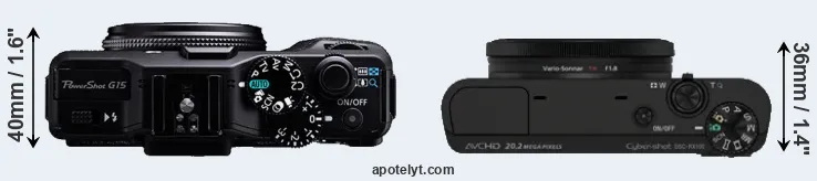 The physical size and weight of the Canon G15 and the Sony RX100 are illustrated in the side-by-side display below. The two cameras are presented according to their relative size. Three consecutive views from the front, the top, and the rear side are shown. All size dimensions are rounded to the nearest millimeter.